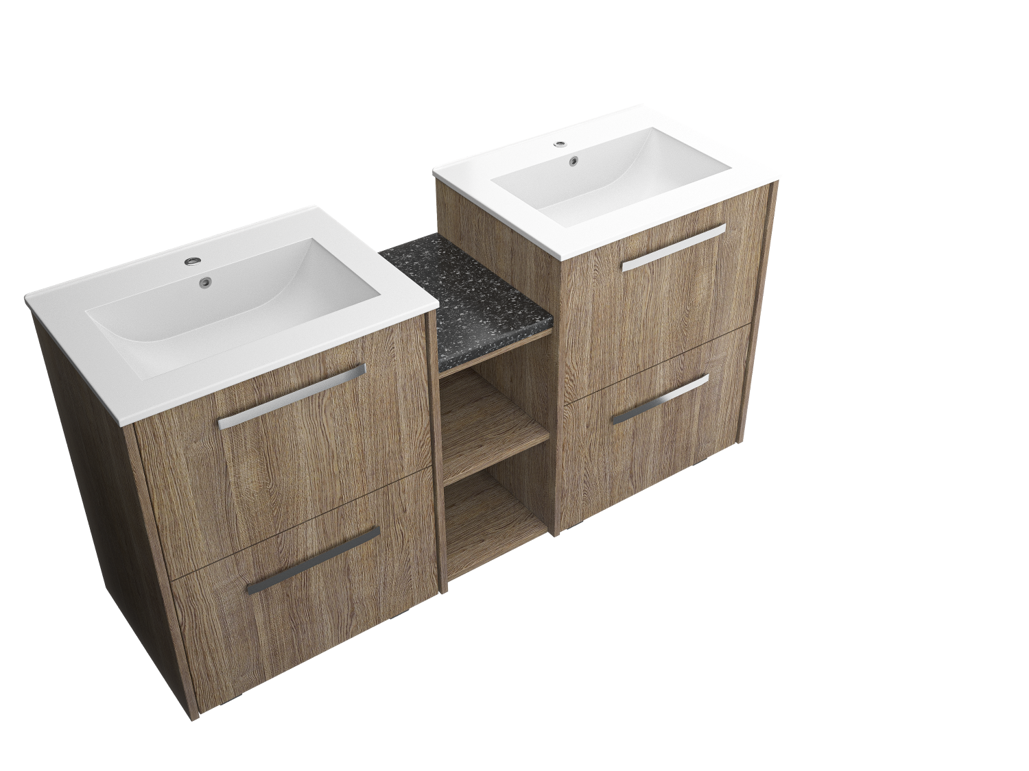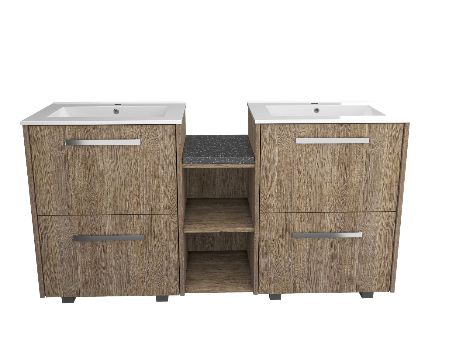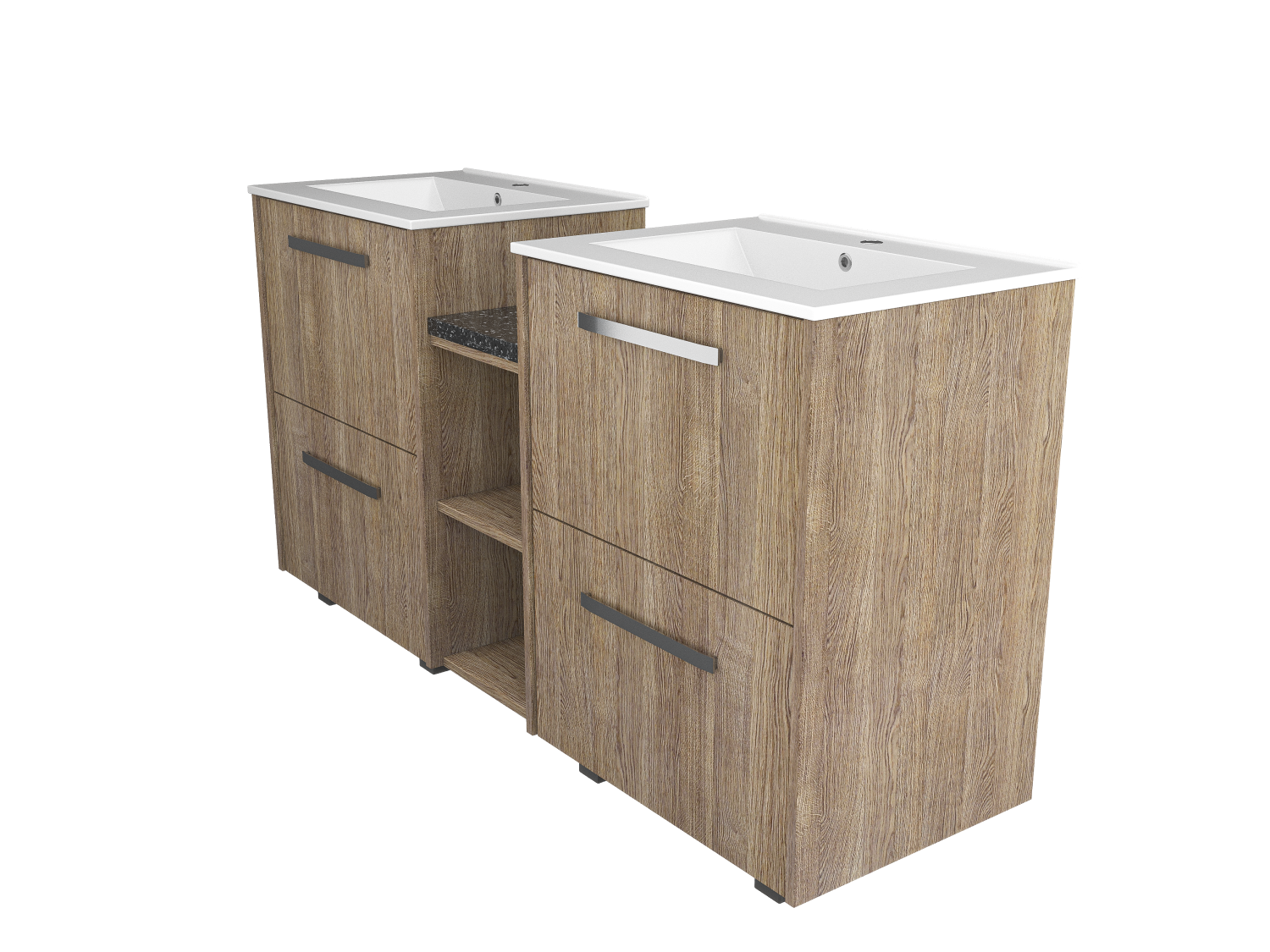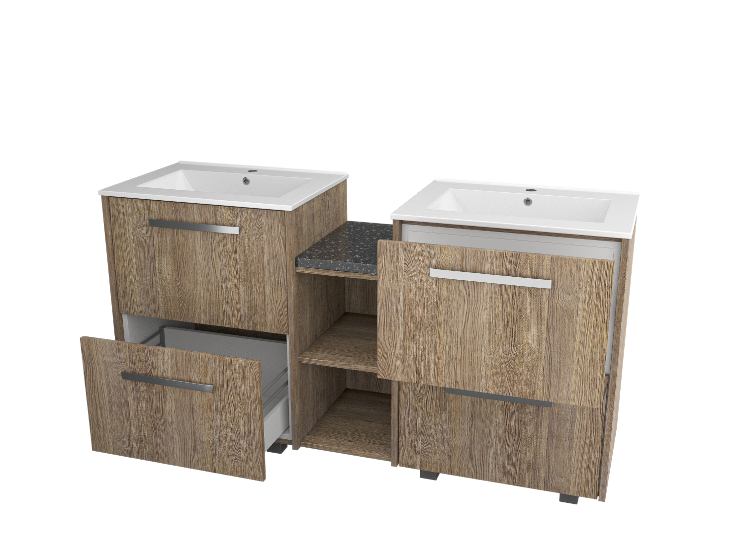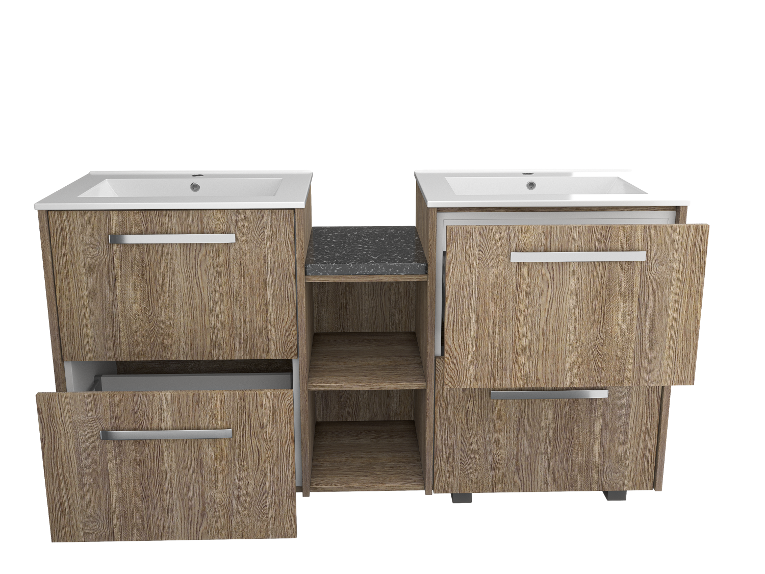A spacious freestanding double sink with pull-out drawers, offering premium wood aesthetics and smart storage solutions for a stylish bathroom.