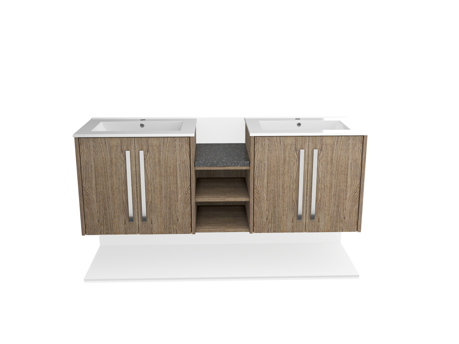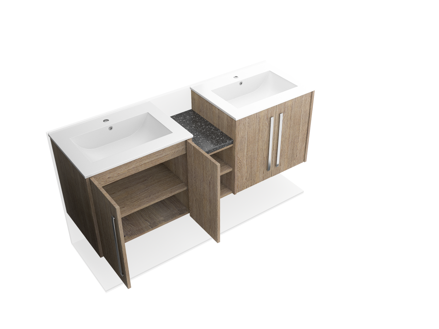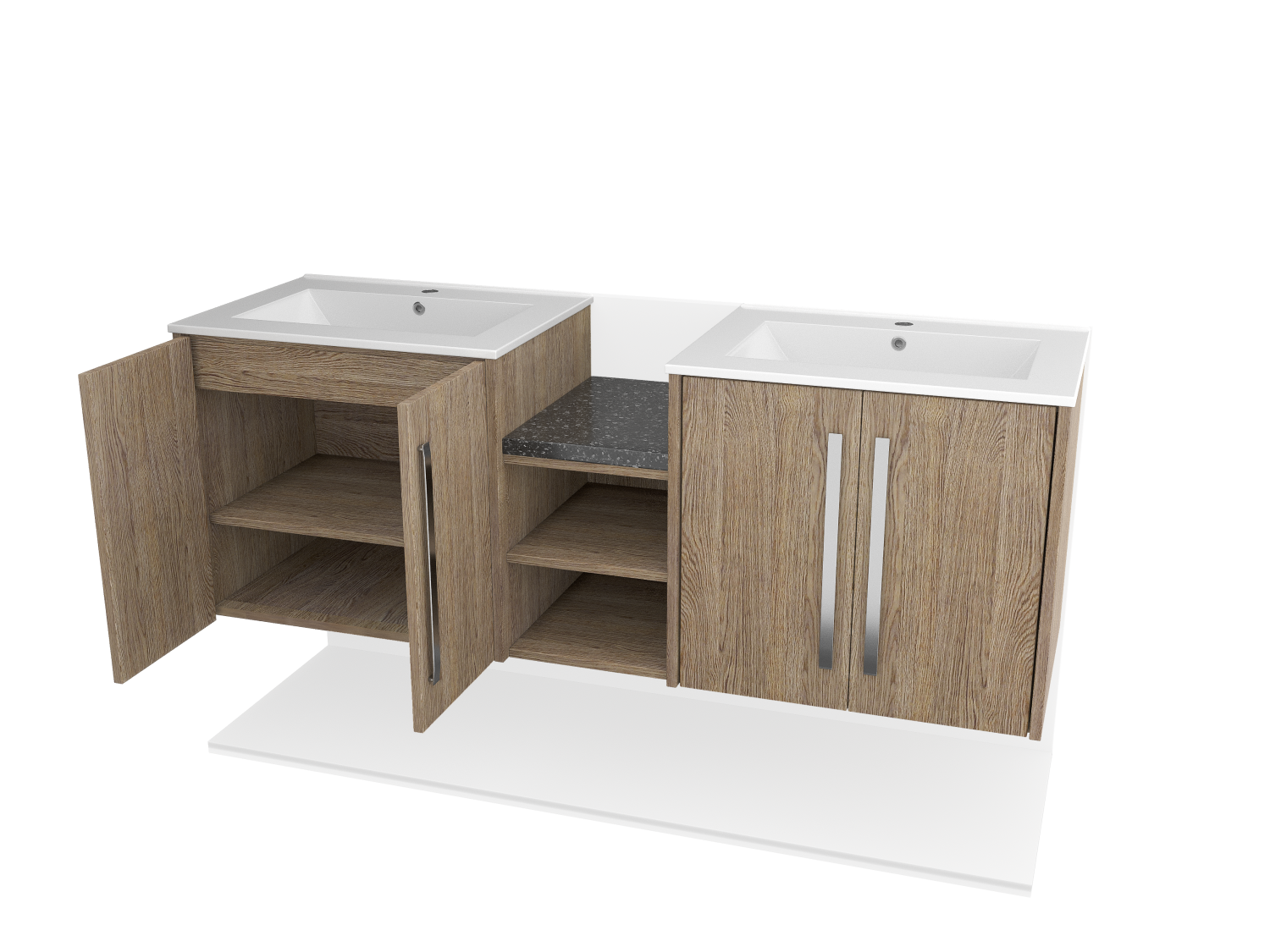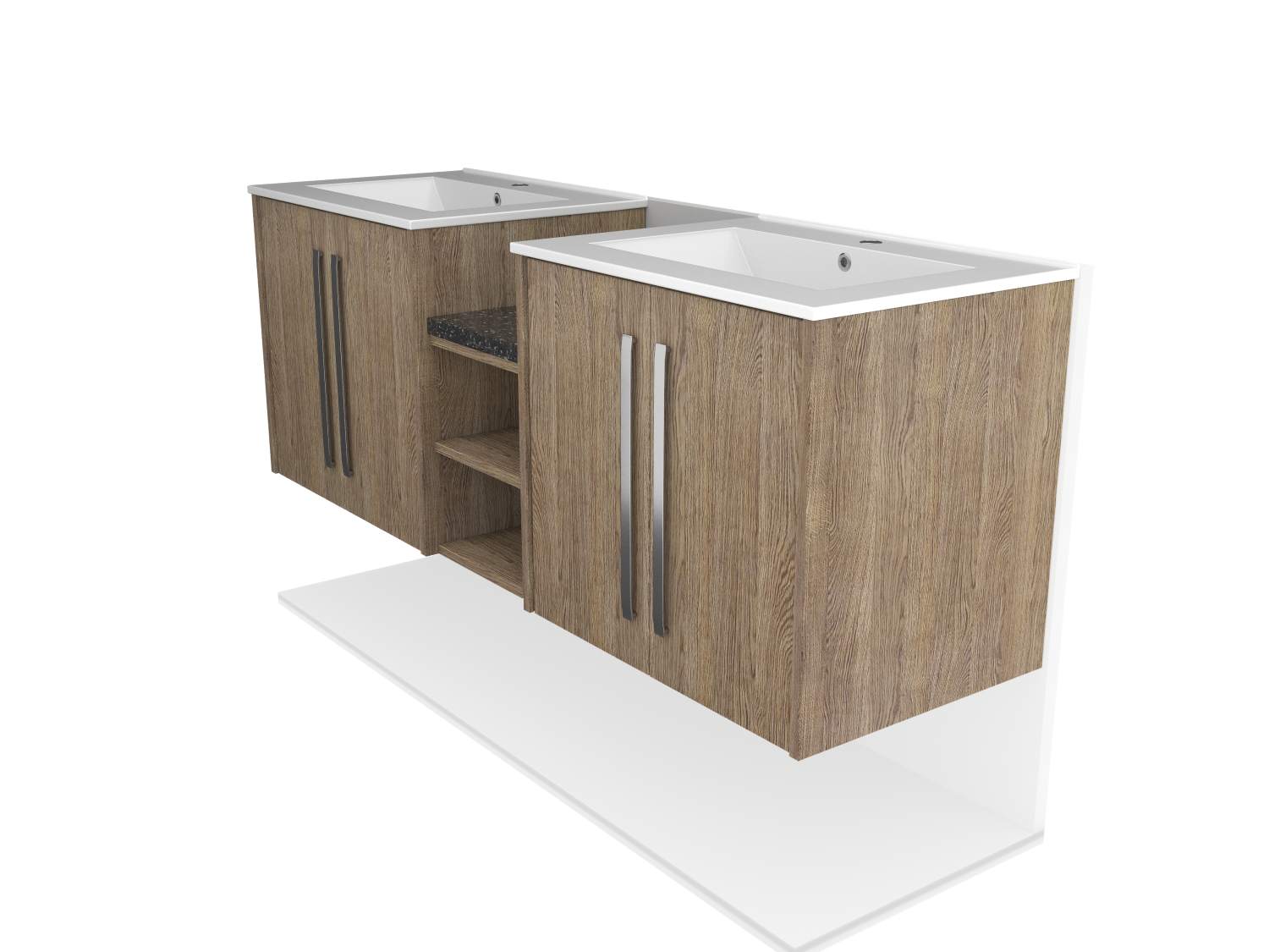 Upgrade your bathroom with a sleek wall-mounted double sink featuring a stylish wood facade and double doors. Space-saving, durable, and modern.