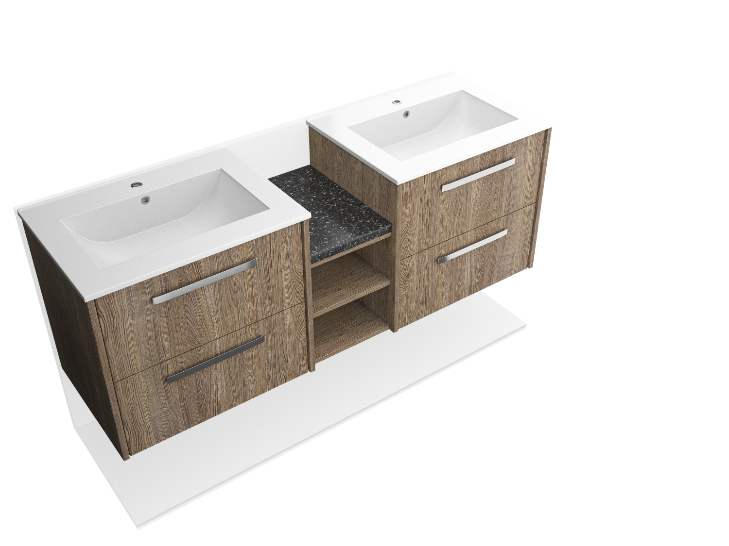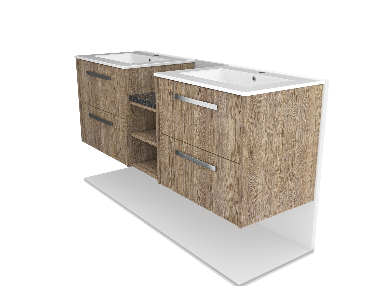 Maximize bathroom storage with a contemporary wall-mounted double sink featuring pull-out drawers and a high-quality wood facade. Perfect for modern interiors.
